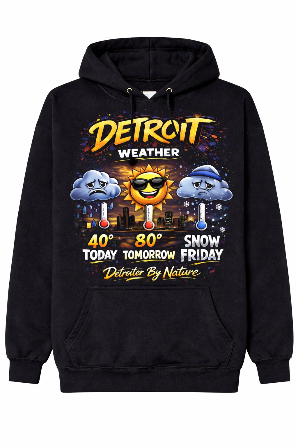 Detroit weather has a personality of its own. One day it's 40°, the next day it's 80°, and somehow snow shows up by Friday. This funny “Detroit Weather” hoodie by Detroiter By Nature perfectly captures the unpredictable Motor City forecast with a bold, street-style graphic Detroiters instantly understand.